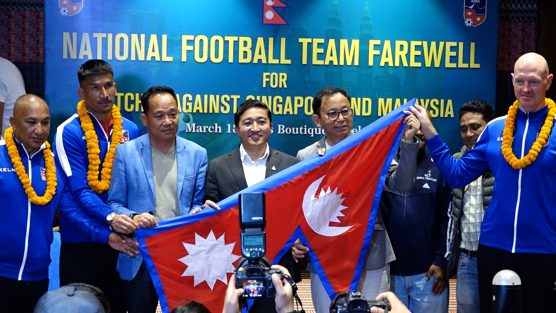 काठमाडौं । सिंगापुरविरुद्धको मैत्रीपूर्ण खेल र एएफसी एसियनकप छनोटअन्तर्गत मलेसियाविरुद्धको खेल खेल्न जाने नेपाली राष्ट्रिय पुरुष फुटबल टोलीको बिदाई गरिएको छ । मंगलबार काठमाडौंको कोटेश्वरस्थित डिस बुटिक होटलमा आयोजित कार्यक्रमका बीच उनीहरुलाई राष्ट्रिय खेलकुद परिषद राखेप सदस्य सचिव टंकलाल घिसिङ, एन्फा अध्यक्ष पंकज विक्रम नेम्वाङ लगायतले बिदाई गरिएको हो ।