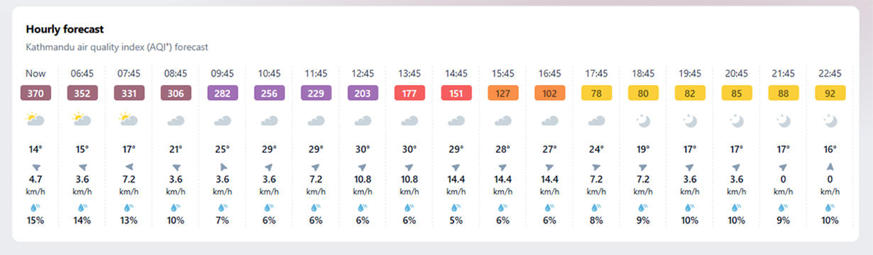 आज बिहान पनि खतरनाकको तहभन्दा माथि नै छ । आईक्यूएयरको तथ्यांक अनुसार आज बिहान काठमाडौंको औसत एयर क्वालिटी इन्डेक्स (एक्युआई) रौंभन्दा तीन गुणा मसिना धुलो धुवाँका कण प्रतिघण्टा ३७० माइक्रोग्राम प्रतिघनमिटर मापन गरिएको छ ।