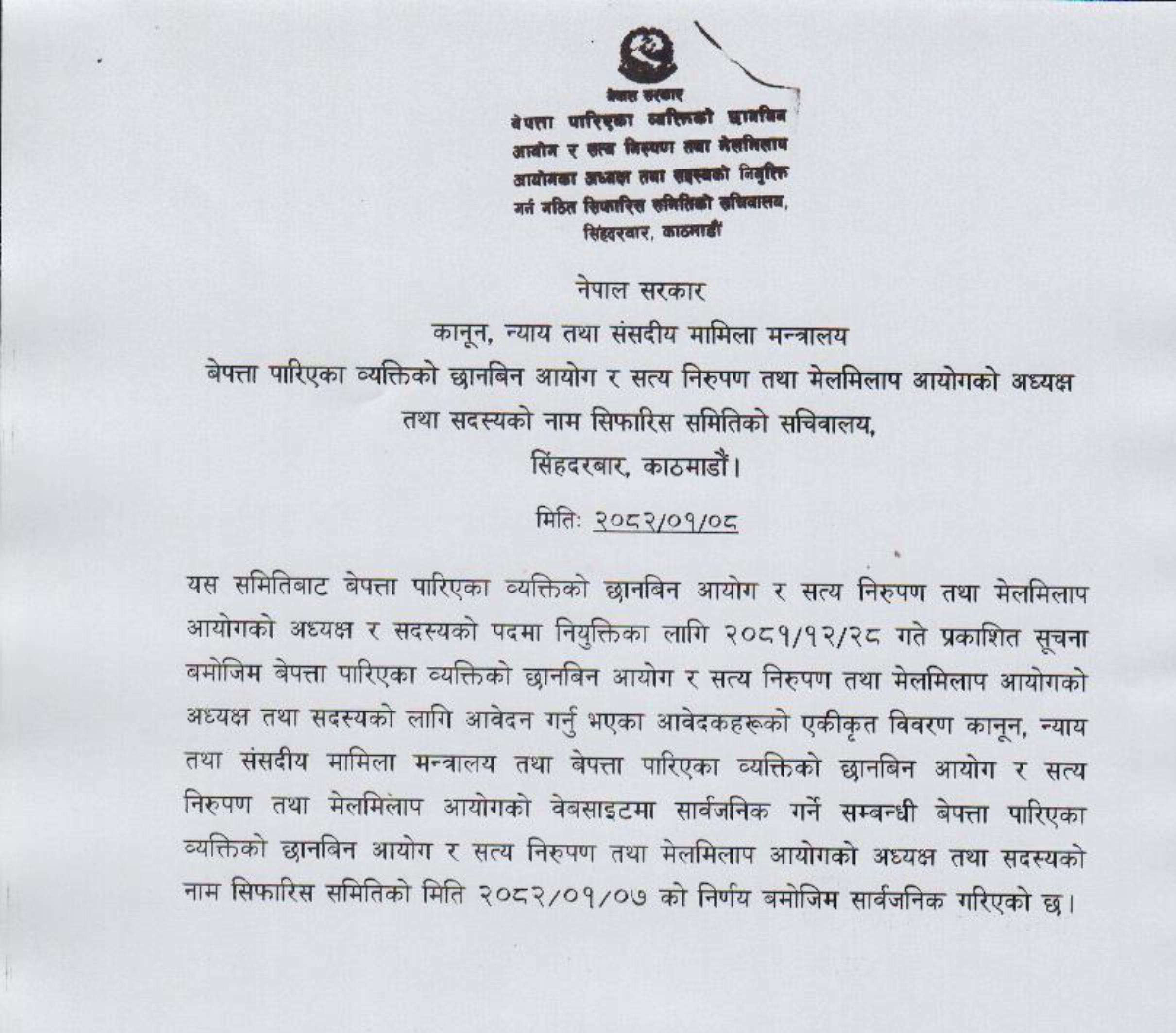 पूर्वप्रधानन्यायाधीश ओमप्रकाश मिश्रको नेतृत्वमा गठन भएको सिफारिस समितिले सार्वजनिक गरेको सूचीअनुसार दुई अध्यक्ष र सदस्यका लागि व्यक्तिगततर्फ ८२ जनाको आवेदन परेको हो । संस्थागततर्फ भने २९ जनाको आवेदन परेको छ । शान्ति प्रक्रियाको विषय टुंग्याउन भन्दै केही दिनअघि शीर्ष तीन दलका शीर्ष नेता पनि छलफलमा बसेका थिए ।