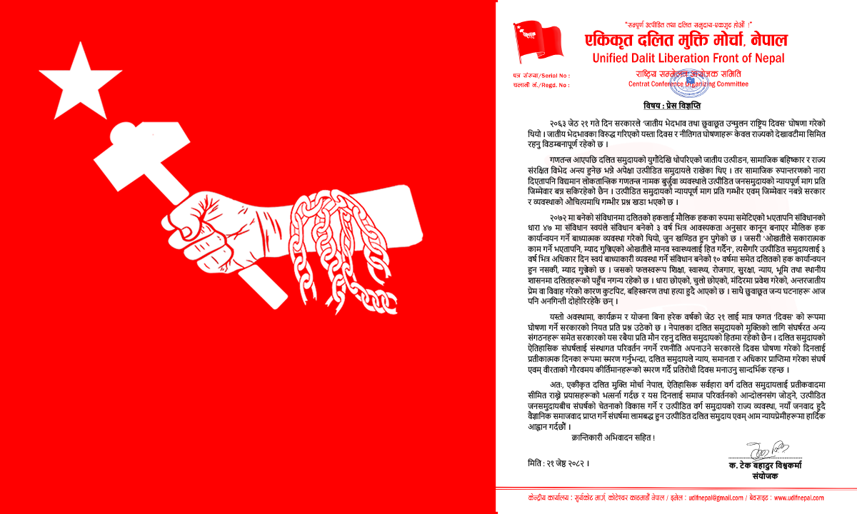 अतः, एकीकृत दलित मुक्ति मोर्चा नेपाल, ऐतिहासिक सर्वहारा वर्ग दलित समुदायलाई प्रतीकवादमा सीमित राख्ने प्रयासहरूको भत्सर्ना गर्दछ र यस दिनलाई समाज परिवर्तनको आन्दोलनसंग जोड्ने, उत्पीडित जनसमुदायबीच संघर्षको चेतनाको विकास गर्ने र उत्पीडित वर्ग समुदायको राज्य व्यवस्था, नयाँ जनवाद हुदै वैज्ञानिक समाजवाद प्राप्त गर्ने संघर्षमा लामबद्ध हुन उत्पीडित दलित समुदाय एवम् आम न्यायप्रेमीहरूमा हार्दिक आह्वान गर्दछौं ।