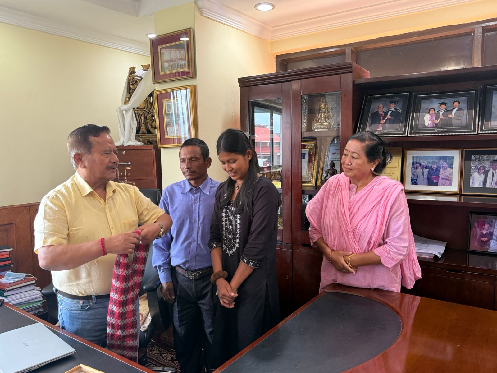 बिहीबार गोमालाई भाटभटेनीस्थित आफ्नै कार्यालयमा बोलाएर अध्यक्ष गुरूङ र श्रीमती सावित्री गुरूङले एकलाख रुपैयाँ नगद, एउटा ल्यापटप र सम्मानपत्रसहित सम्मान गरेका थिए ।